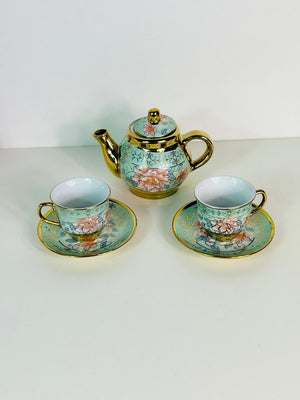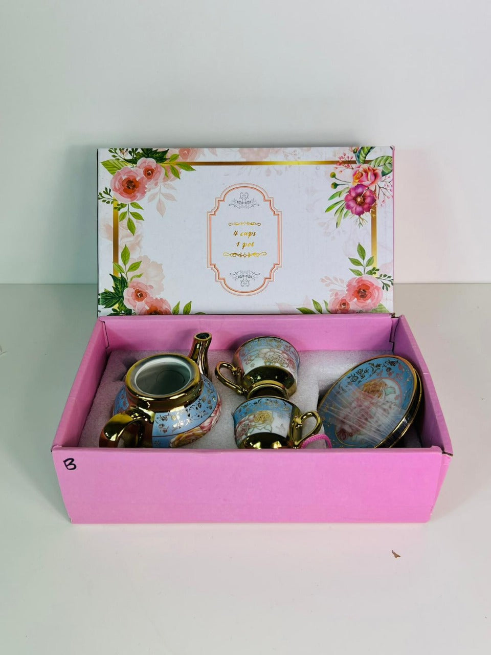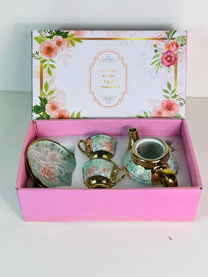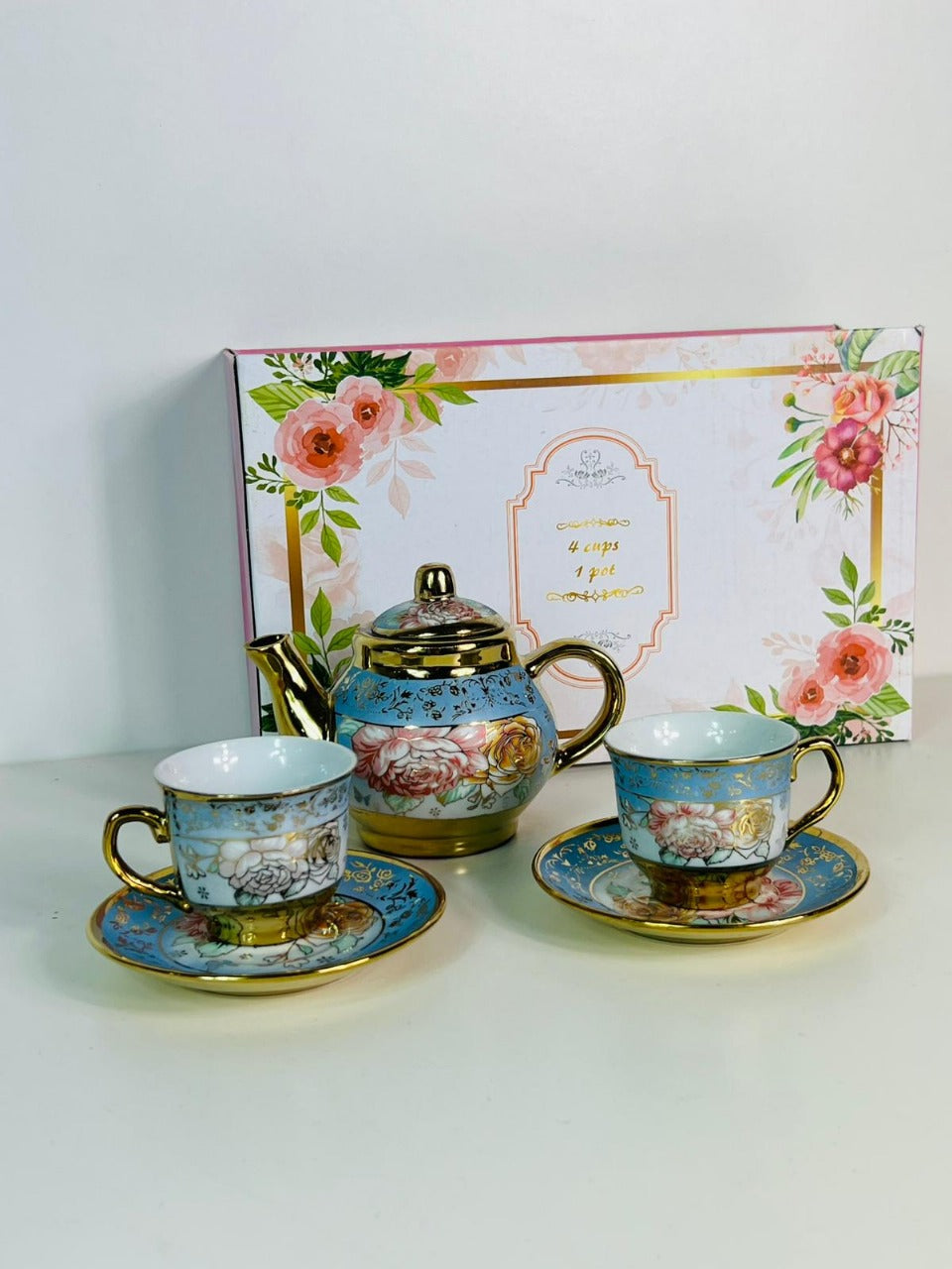 Ceramic 4 Cups & 1 Pot Set with Elegant Floral Stylish Design and Gold Trim for Tea Lovers